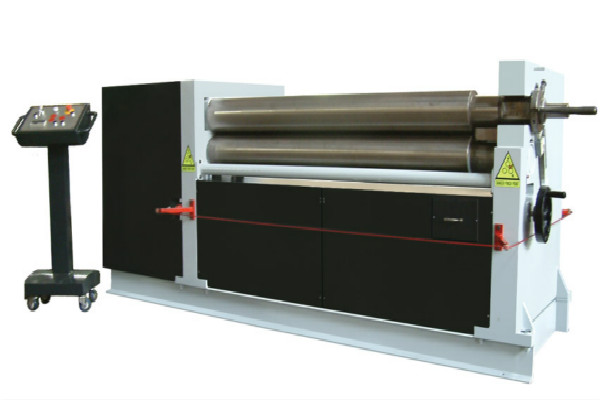 液壓式三輥卷板機(jī)結(jié)構(gòu)形式為三輥對(duì)稱式,卷板機(jī)上輥在兩下輥中央對(duì)稱位置通過(guò)液壓缸內(nèi)的液壓油作用于活塞作垂